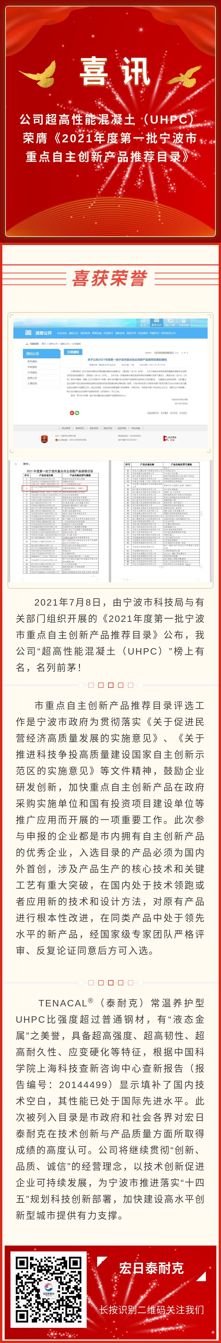 喜訊!公司超高性能混凝土(UHPC)榮膺《2021年度第一批寧波市重點自主創新產品推薦目錄》